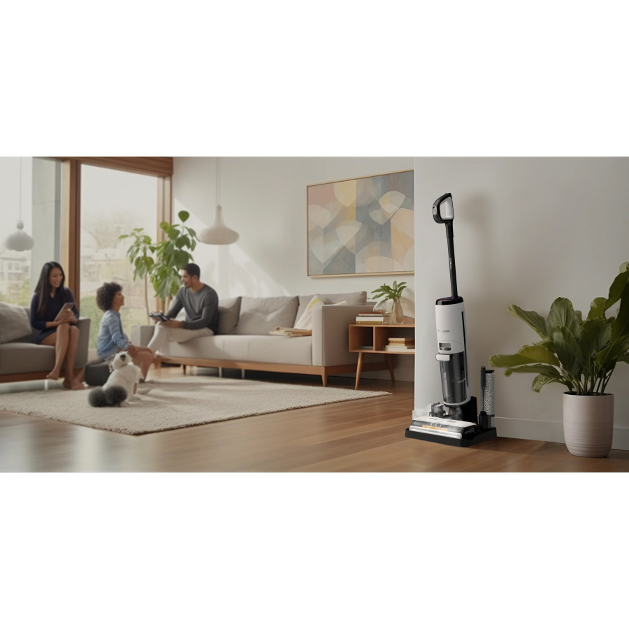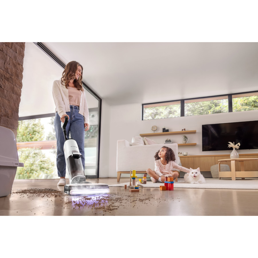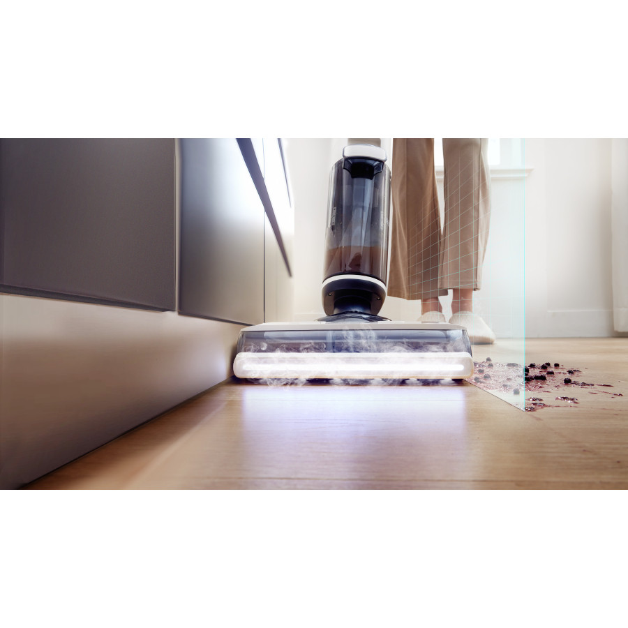 Tineco Floor One S7 Steam Plus вичищає простір там, де звичайні пилососи не здатні. Двобічна крайова система прибирає вздовж плінтусів, між ніжками стільців і в глибоких кутах без пропусків. Шерсть, крихти, пил після тварин — усе зникає без повторного проходу або окремої щітки. Кожен міліметр підлоги виглядає так, ніби тут щойно робили генеральне прибирання. Пристрій проходить між ніжками стільців, уздовж плінтусів і під шафами без потреби щось підіймати чи пересувати.