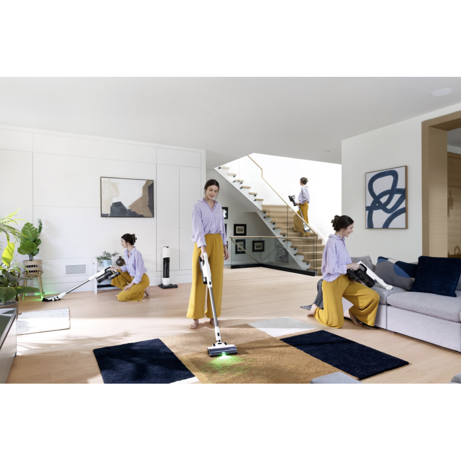 Классическая проблема пылесосов — засорение трубок и щеток волосами и мусором. Station 5 оснащен уникальной системой ClogLess. Конструкция головки щетки, широкая трубка и увеличенный диаметр соединения внутри пылесоса не дают мусору накапливаться и блокировать поток воздуха. Щетка ZeroTangle с V-образной щетиной и двойным гребнем одновременно собирает волосы без наматывания. Это значительно упрощает обслуживание и делает уборку комфортнее. Подсветка помогает не пропустить ни одного загрязненного уголка.